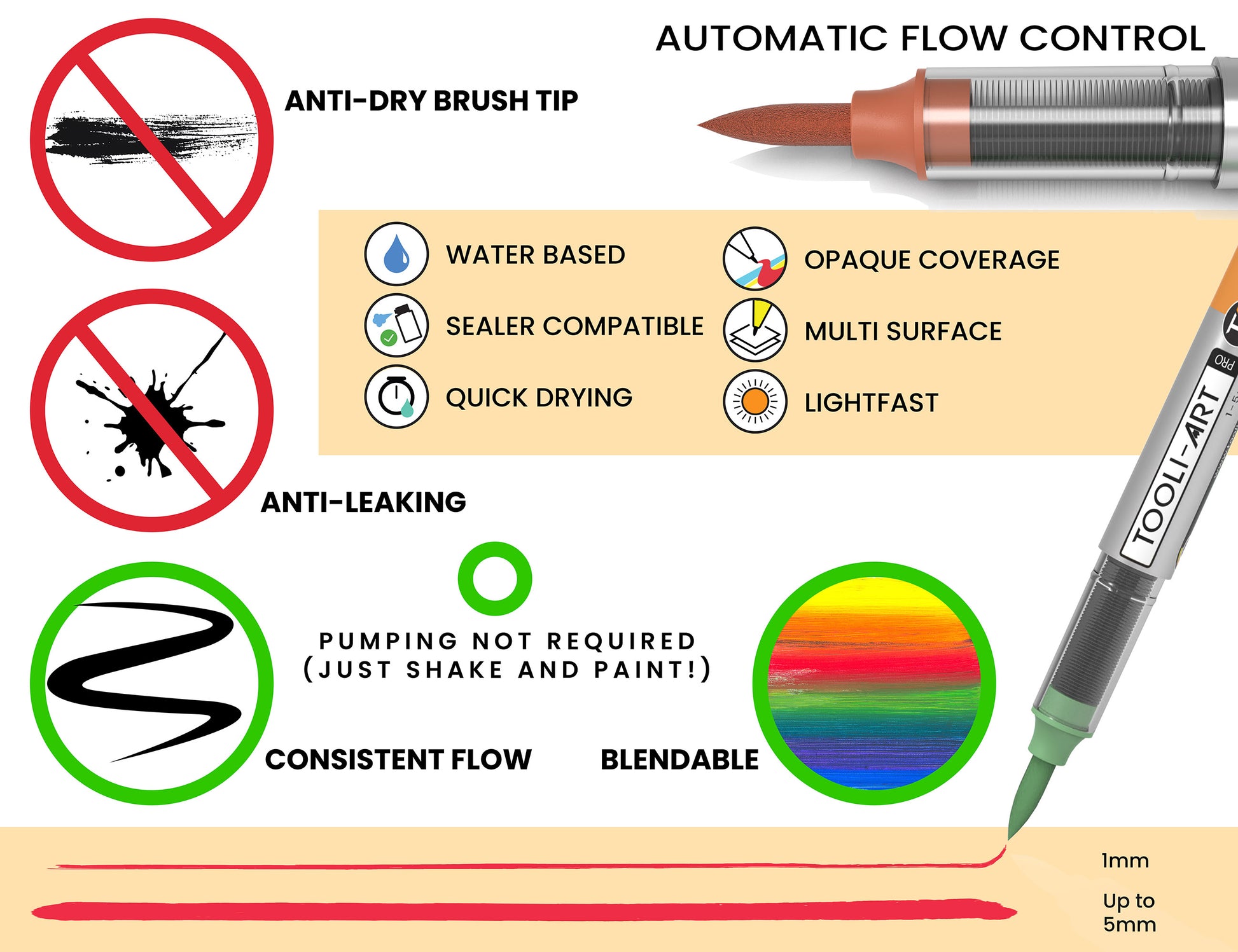 ✅FLOW CONTROL TECHNOLOGY – Unlike common cotton core brush pens which can come out dry, spotty, or uneven, automatic flow technology makes smooth and even paint flow that is also opaque and vibrant every time. The constant flow makes covering larger areas much easier. This also adds to a longer shelf life because there is no cotton core to dry up. Pumping and priming are not required. Just shake well and start painting!