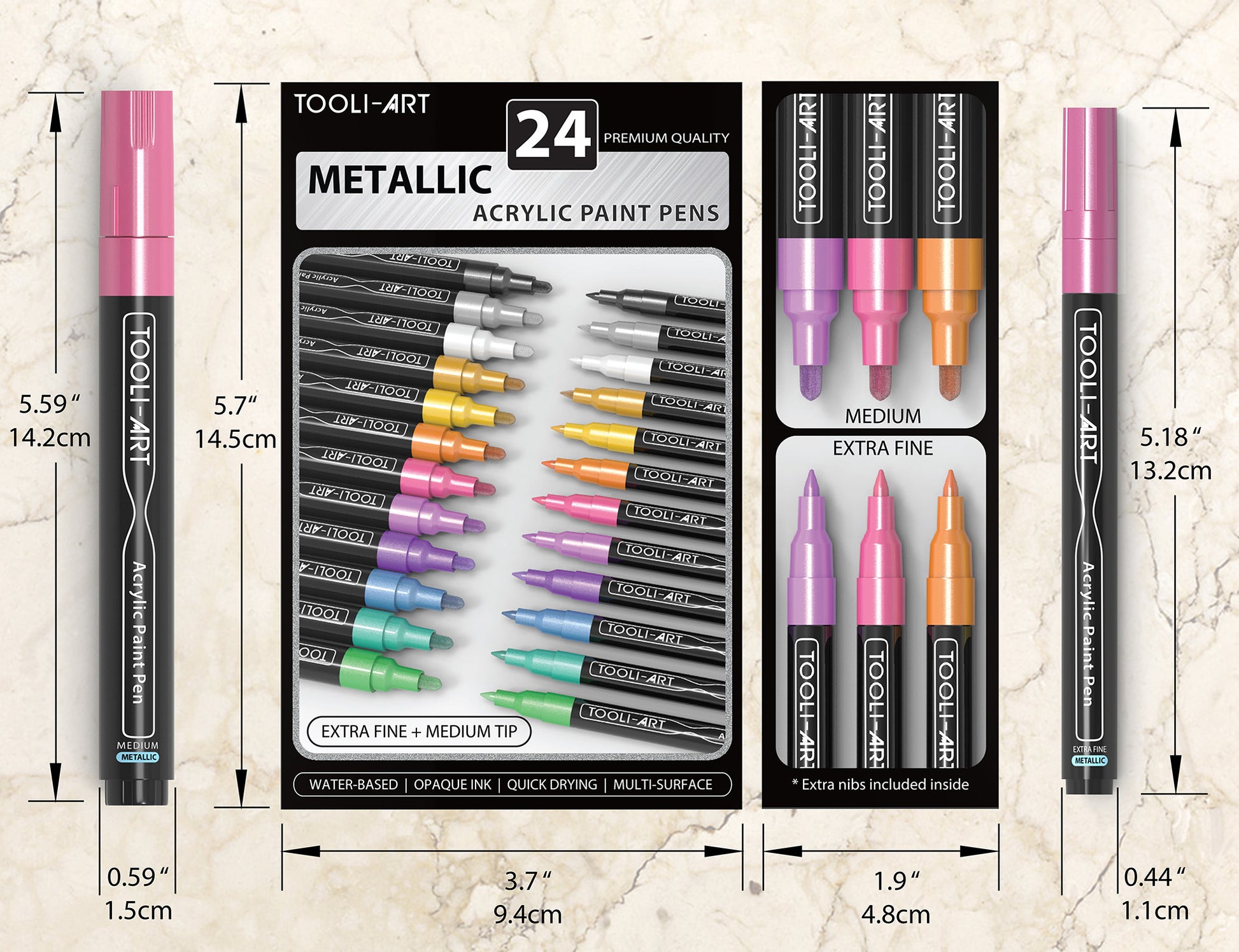 TOOLI-ART Metallic Acrylic Paint Pens 24 Marker Set (0.7mm EXTRA FINE + 3.0mm MEDIUM)